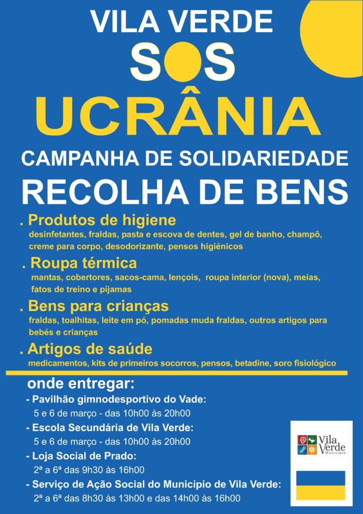 A campanha de solidariedade “Vila Verde SOS Ucrânia” visa a recolha de bens, como produtos de higiene e de alimentação, artigos de saúde e vestuário.