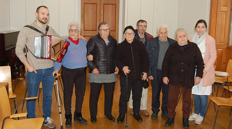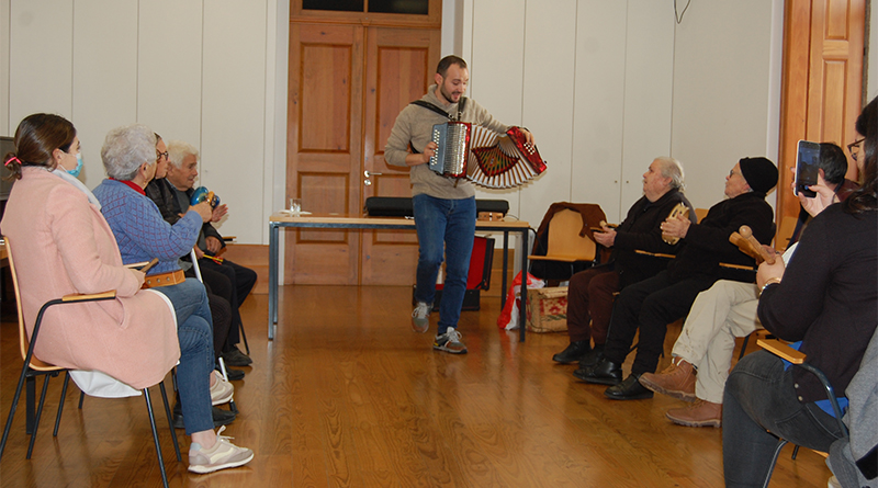 Já com a animação instalada é altura de cada um ter direito a um instrumento. O professor Eduardo distribui os ferrinhos, o reco-reco, o bombo, entre outros e pega na concertina. Marcando o ritmo com os pés, os seis participantes tocam e cantam afinadíssimos, mais um conjunto de músicas populares.