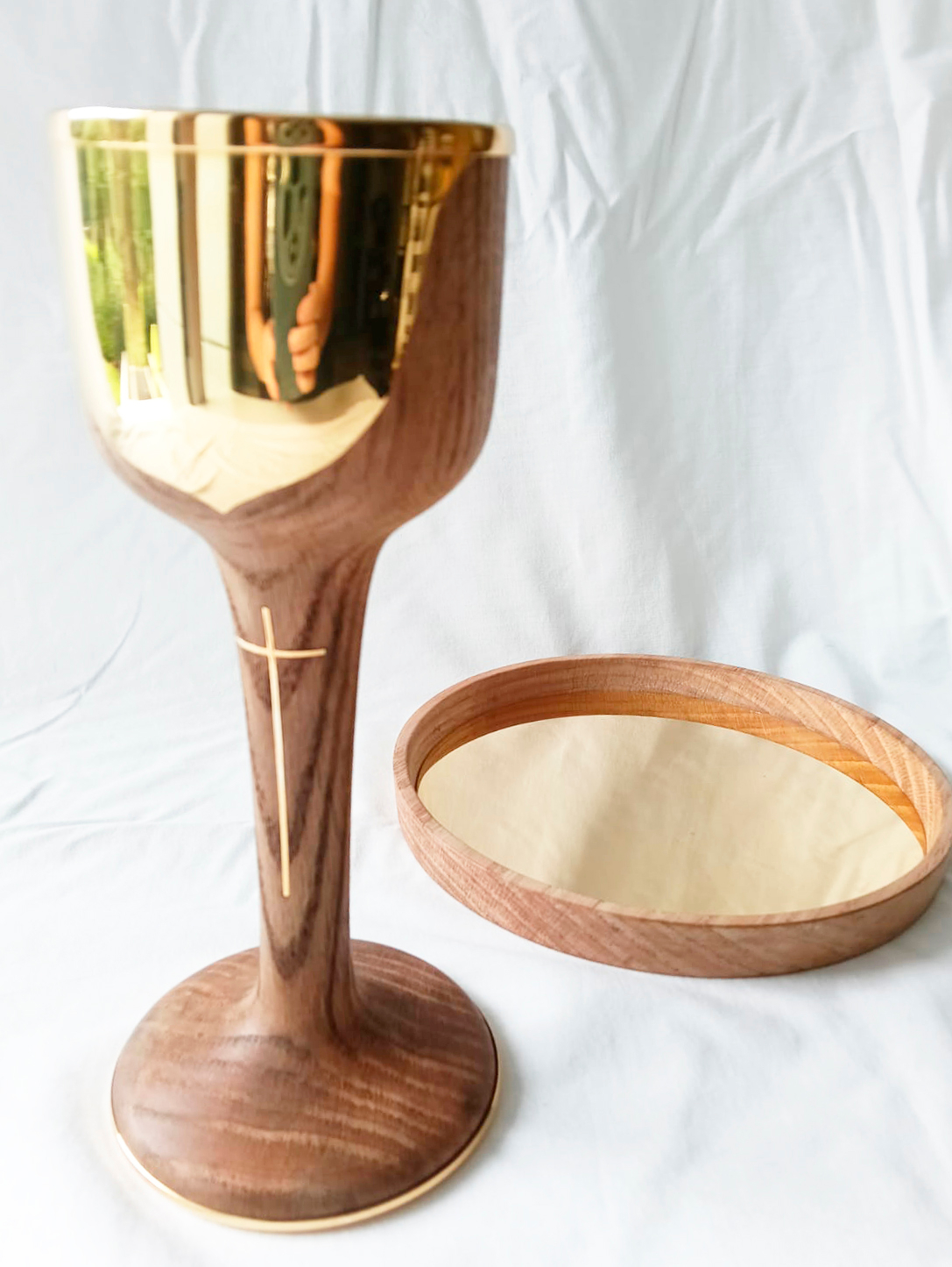A estrutura do cálice, com cerca de 23 cm de altura, é composta por madeira de carvalho, com copo, base e frente em prata com banho de ouro. Está bem visível uma cruz, incrustada na madeira, reforça o gesto de Cristo na Cruz, ecoando o ponto alto da sua missão redentora. A patena, com 20 cm de diâmetro, acompanha esta estética e simbolismo, conjugando madeira e metais nobres, num equilíbrio entre simplicidade e nobreza.