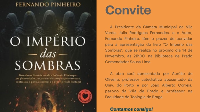 Biblioteca de Prado Comendador Sousa Lima, em Prado acolhe hoje à noite, às 21h00, a apresentação do livro “O Império das Sombras”, da autoria de Fernando Pinheiro.