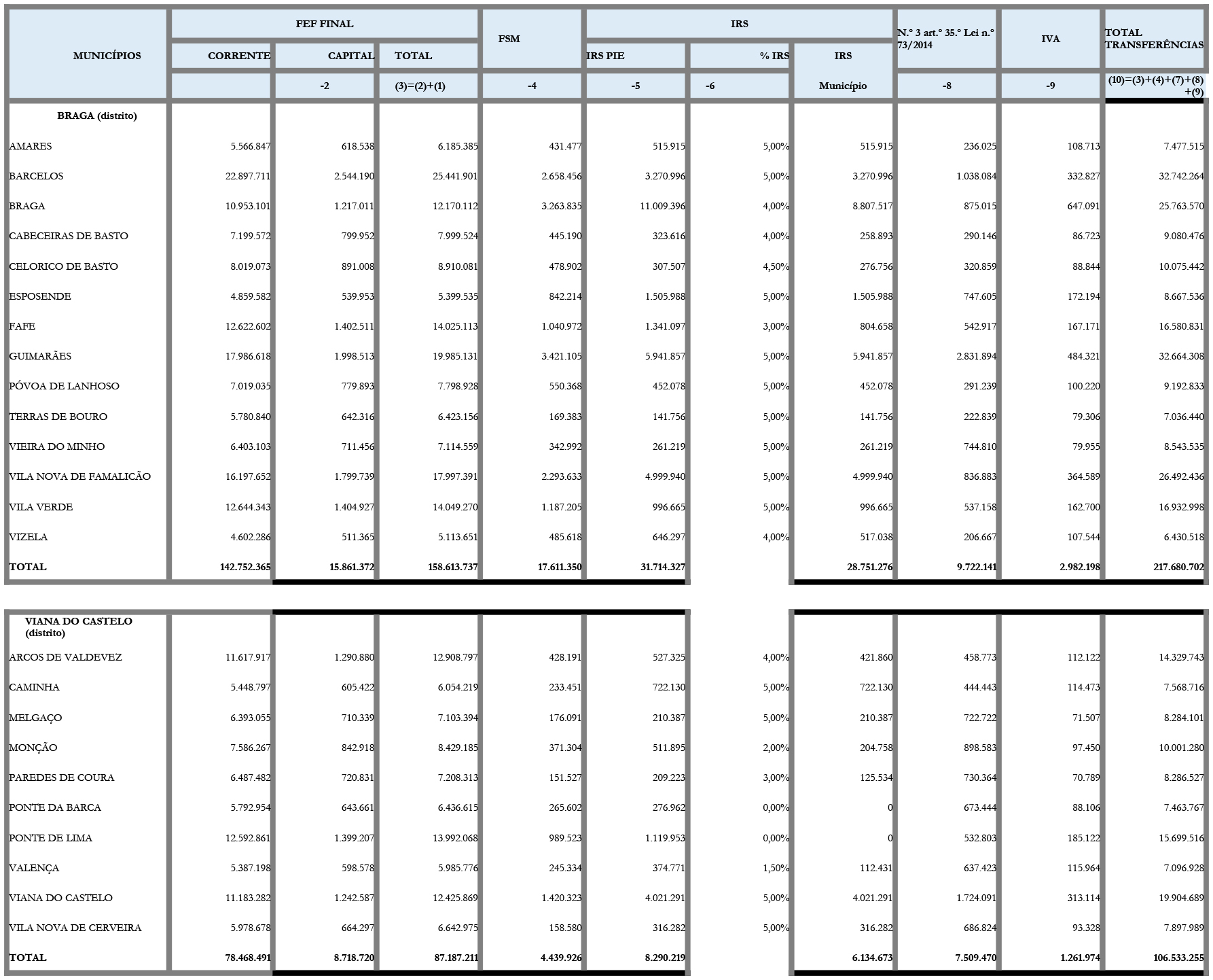 Para além destes valores, o próprio Município através do Fundo de Equilíbrio Financeiro irá receber sete milhões 036 mil 440 euros dos quais 141 756 do IRS e 79 306 do IVA.