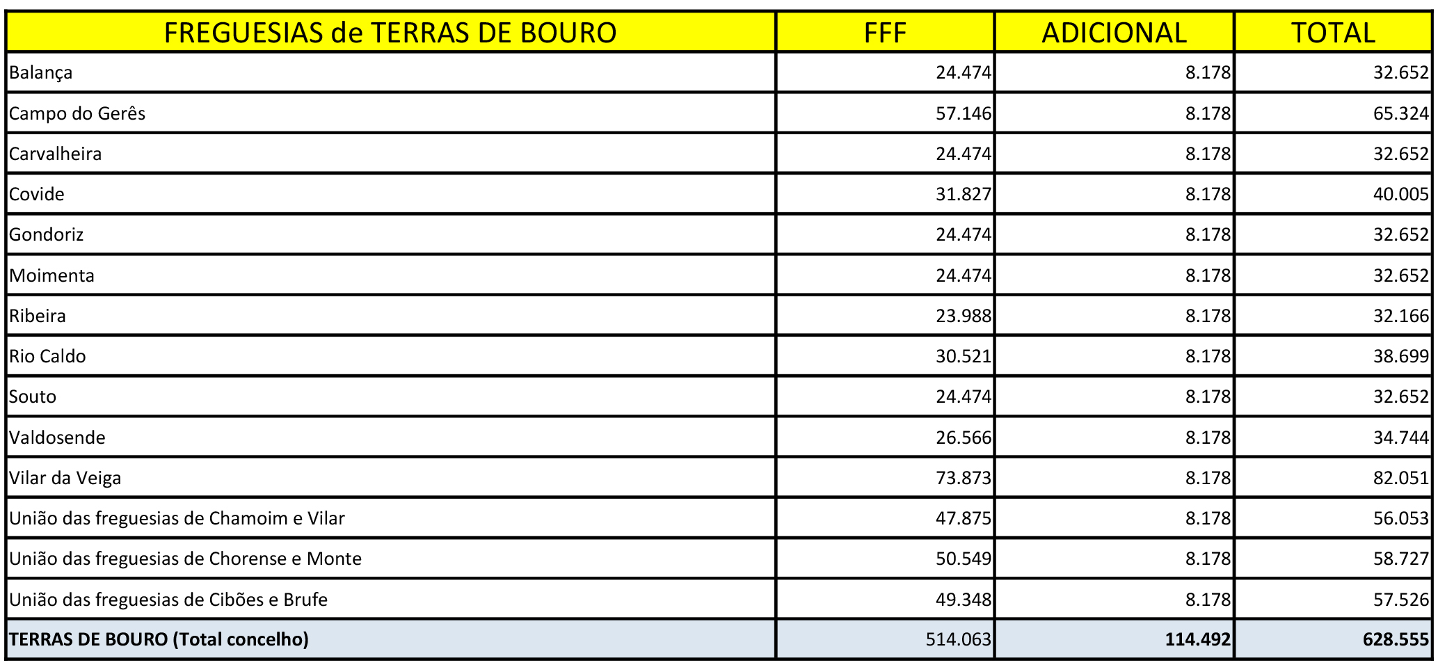 São 628 555 euros a distribuir pelas 14 freguesias do concelho de Terras de Bouro. Ribeira é a que menos recebe (32 166), Vilar da Veiga lidera a tabela com 82 051.