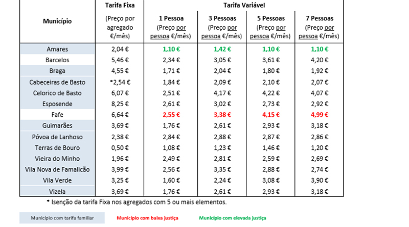 Relativamente ao município de residência, encontram-se também disparidades dentro do distrito de Braga em 2020. Uma pessoa paga 1,58€/mês se viver em Terras de Bouro, enquanto se viver em Esposende essa mesma pessoa vai pagar 10,85€/mês.