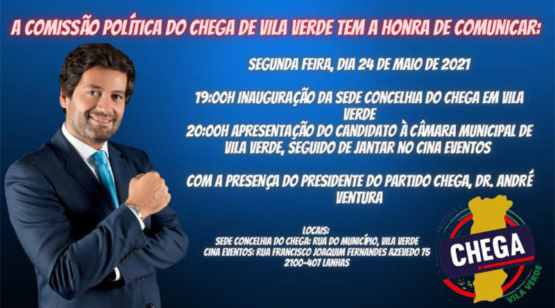 O Chega Vila Verde irá apresentar o seu candidato à câmara municipal de Vila Verde, no próximo dia 24 de Maio pelas 20h00, num evento que irá ocorrer no Cina Eventos em Lanhas. O destaque vai para a presença do deputado e líder do partido André Ventura.