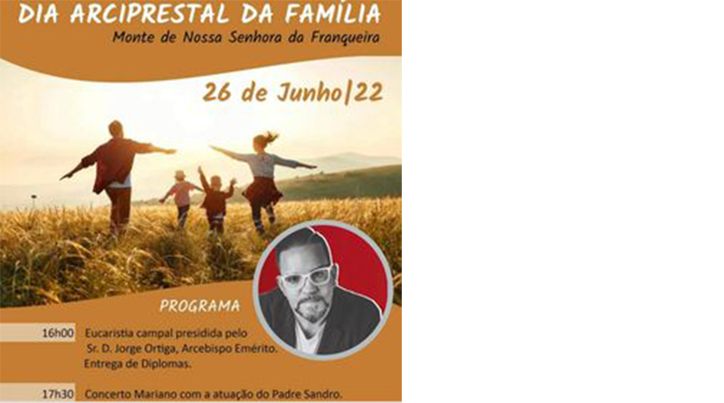 A Equipa Arciprestal da Pastoral Familiar realiza o Dia arciprestal da família É no dia 26 de junho, no monte de Nossa Senhora da Franqueira, em Pereira, concelho de Barcelos. A missa, marcada para as 16h00, será celebrada pelo Arcebispo emérito, D. Jorge Ortiga.