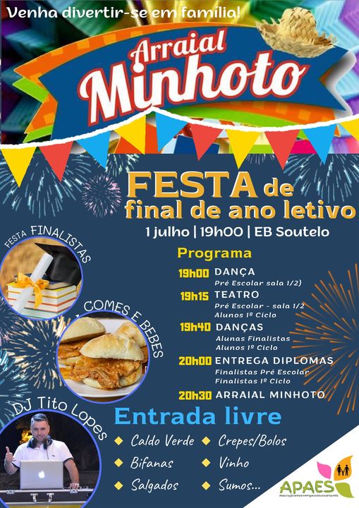 Um arraial minhoto marcado para o próximo dia 1 de julho, na EB de Soutelo assinala o final de mais um ano letivo, a partir das 19h00. Para além dos comes e bebes habituais, o programa é composto por várias atuações dos alunos da escola.