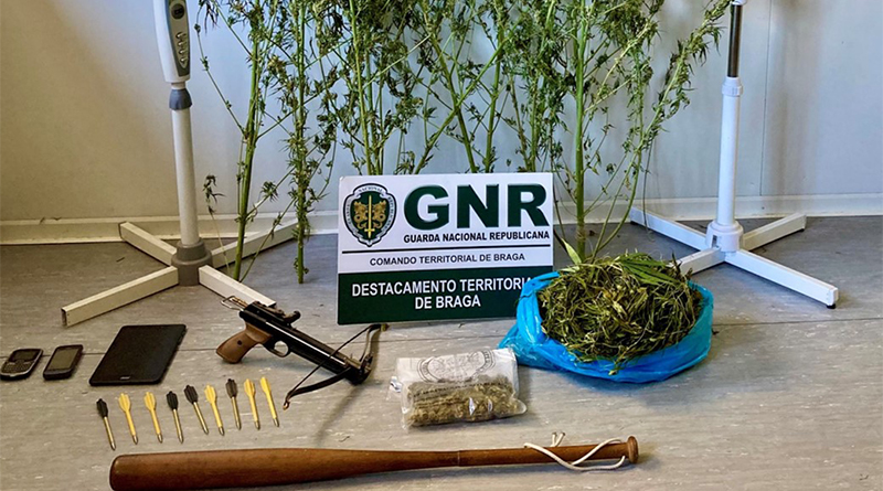 No âmbito de uma investigação por tráfico de estupefacientes, os militares da Guarda deram cumprimento a dois mandados de busca, uma domiciliária e uma não domiciliária em veículo, que culminaram na apreensão de 195 doses de canábis; dez plantas de canábis; dois telemóveis; um tablet; uma besta; nove virotões; um bastão de madeira e duas ventoinhas, utilizadas na secagem das plantas.