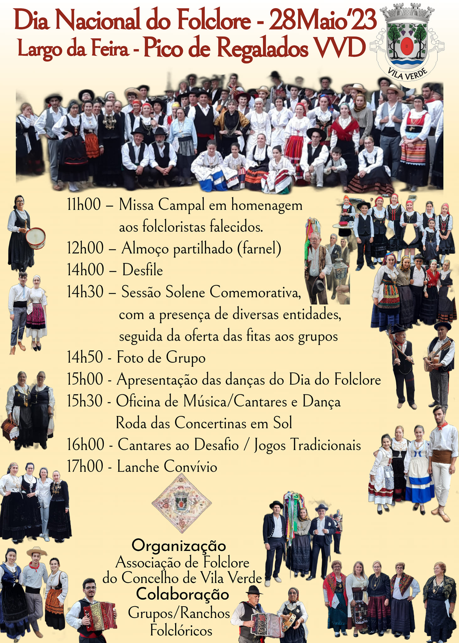 O folclore vai estar em festa em Vila Verde, no próximo dia 18 de maio, no largo da Feira em Pico de Regalados. O dia do Folclore arranca com uma missa campal, às 11h00, em homenagem aos folcloristas falecidos. No final, há um almoço partilhado.