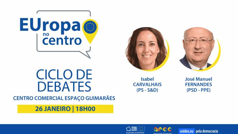No âmbito do ciclo de debates “EUropa no centro”, os eurodeputados Isabel Carvalhais (PS, S&D) e José Manuel Fernandes (PSD, PPE) vão estar no centro comercial Espaço Guimarães, na sexta-feira, dia 26 de janeiro, entre as 18h00 e as 19h00, para abordar temas e iniciativas do Parlamento Europeu, numa conversa aberta ao público conduzida pela jornalista Estela Machado, do Porto Canal.