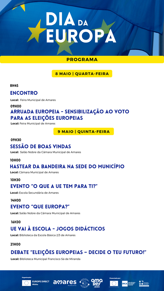 As comemorações vão terminar com o debate “Eleições Europeias: Decide o teu Futuro!”, pelas 21h00, na Biblioteca Municipal Francisco Sá de Miranda. Ricardo Morgado (Deputado ao Parlamento Europeu), Alexandre Dias (Sindicato dos Professores da Região Norte), Paulo Monteiro (Diretor do Jornal Correio do Minho) e João Januário (Presidente da Assembleia Municipal de Amares) são os oradores deste evento, que visa realçar a importância das eleições europeias para o futuro dos cidadãos. O evento vai contar com a participação do Clube Europeu do Agrupamento de Escolas de Amares da Associação Fluir Artes Musicais.