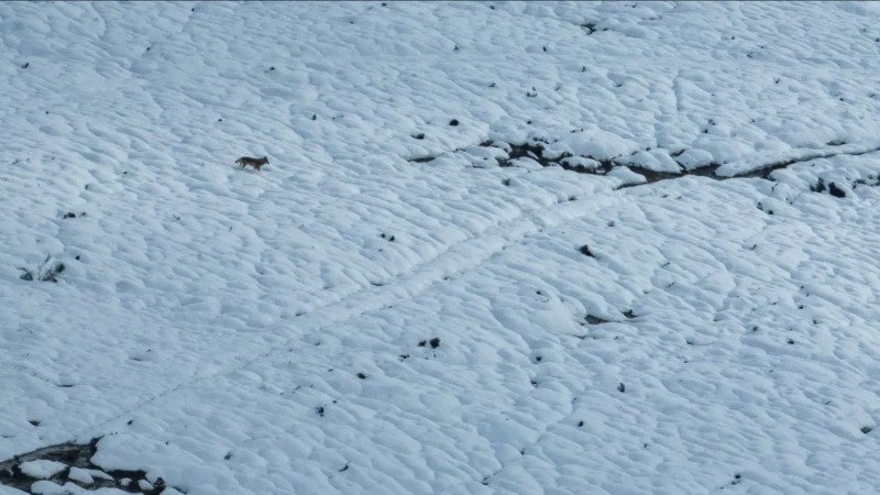 Na imagem vê-se a encantadora paisagem do Gerês pintada de branco e, do lado esquerdo, o lobo, que pé ante pé, parece dirigir-se para algum lado.