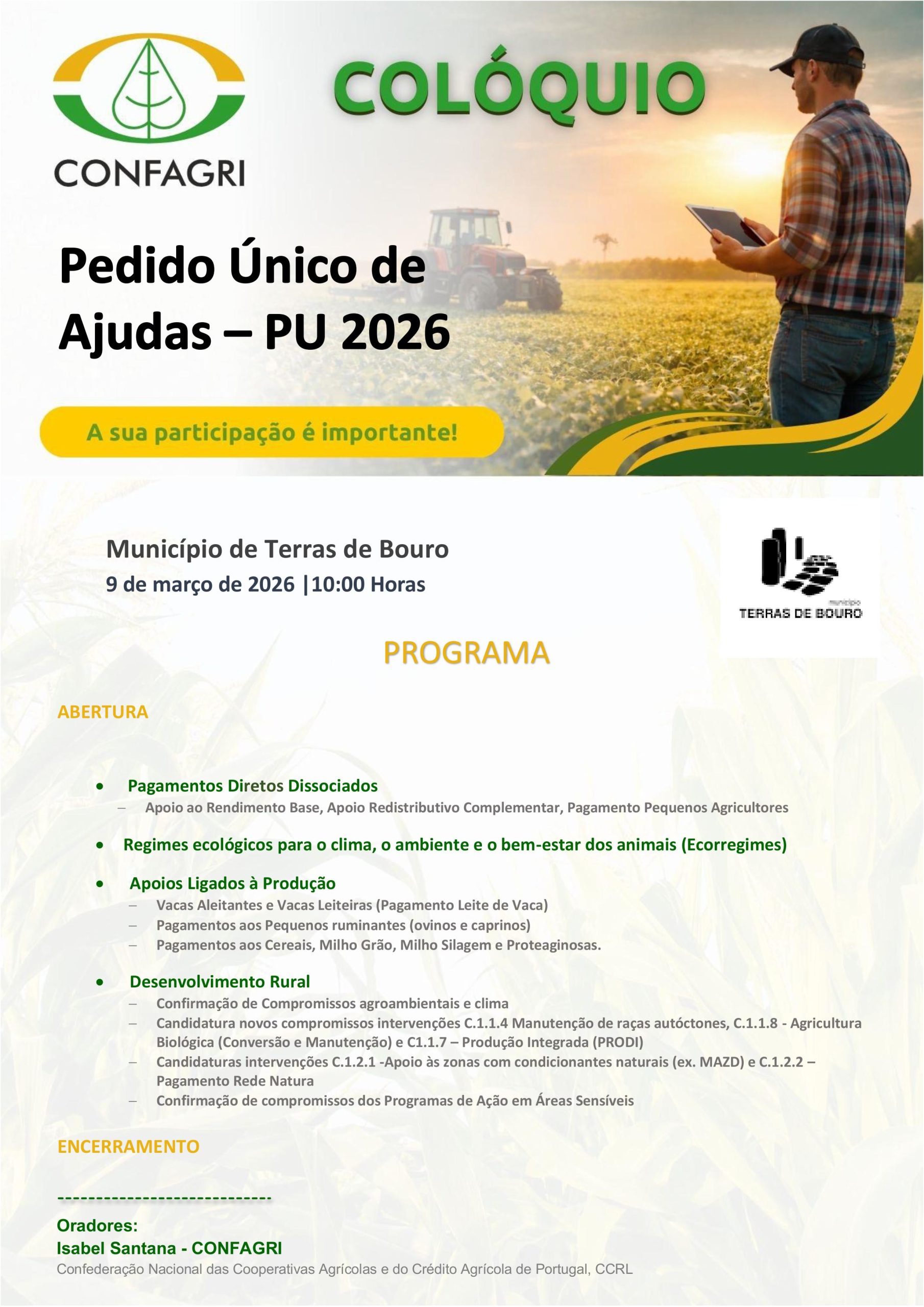 O Município de Terras de Bouro, em colaboração com a CONFAGRI, organiza para todos os produtores uma sessão de esclarecimento fundamental sobre os apoios ao setor para o ano de 2026.