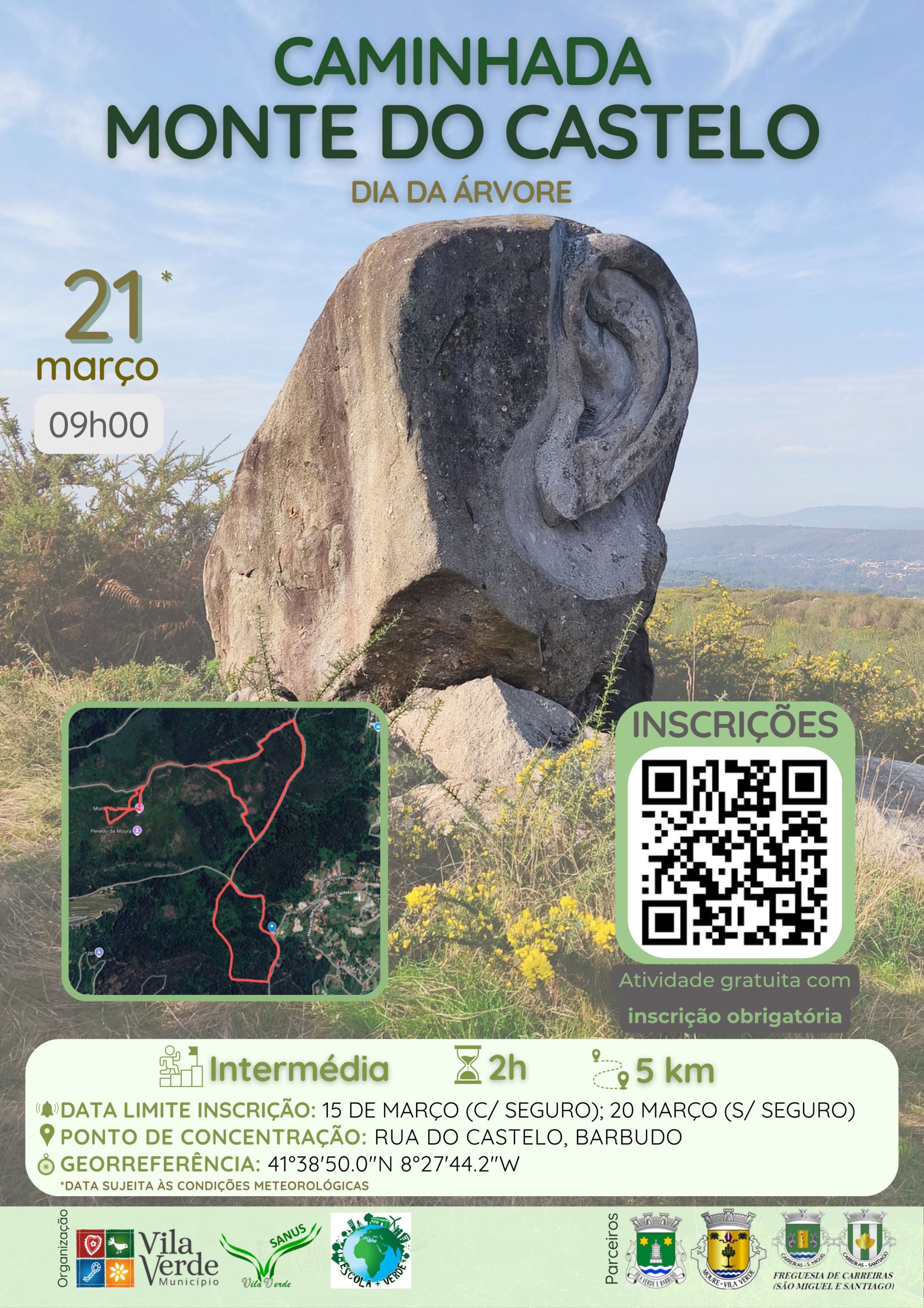 No âmbito das comemorações do Dia da Árvore, o Município de Vila Verde promove, no próximo dia 21 de março, uma caminhada no Monte do Castelo, um espaço natural de grande beleza paisagística e com vários pontos de interesse que tornam o percurso especialmente apelativo.